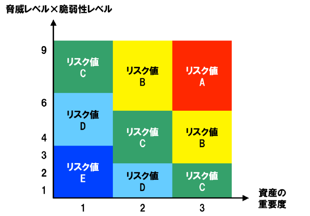 - 重要度 × 脅威レベル × 脆弱性レベル = リスク値
