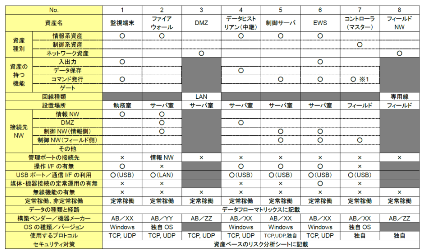 OT資産一覧表の例(制御システムのセキュリティリスク分析ガイド 第2版)